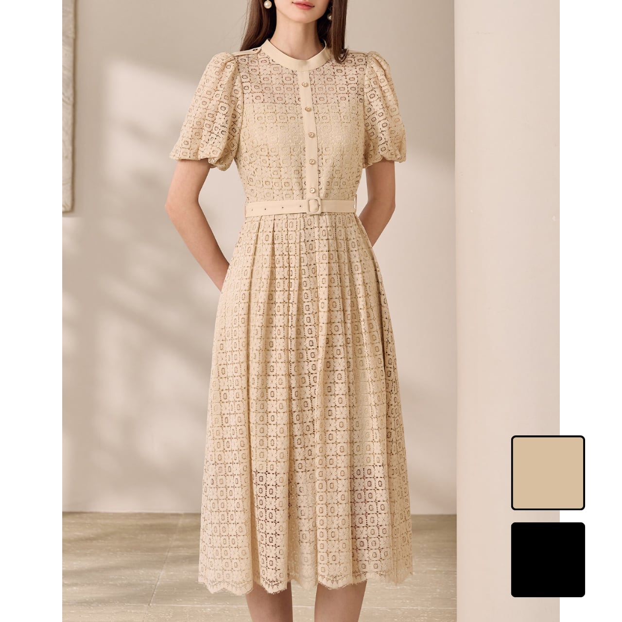 総レースパフスリーブベルト付きフレアワンピース 2color L2207