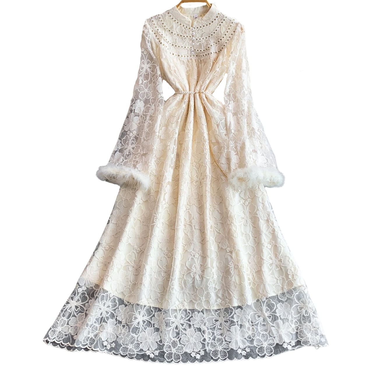 繊細な総レースとスタンドネックが、上品でクラシカルな印象を演出する一着。