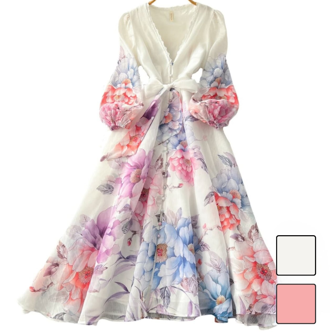 Vネックリボン花柄フレアワンピース 2color L2210