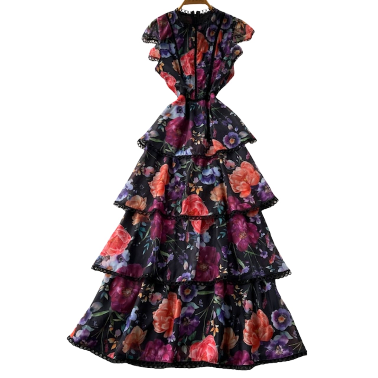 華やかなフラワー柄とティアードフリルが、存在感のあるエレガントな印象を演出します。