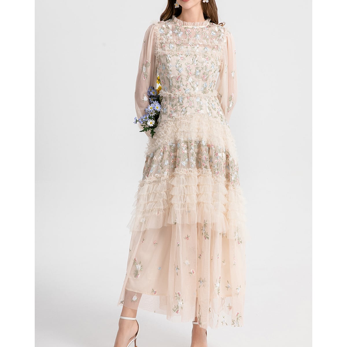 即納【 Mサイズ 】チュール刺繍 ティアードロングワンピース L1712