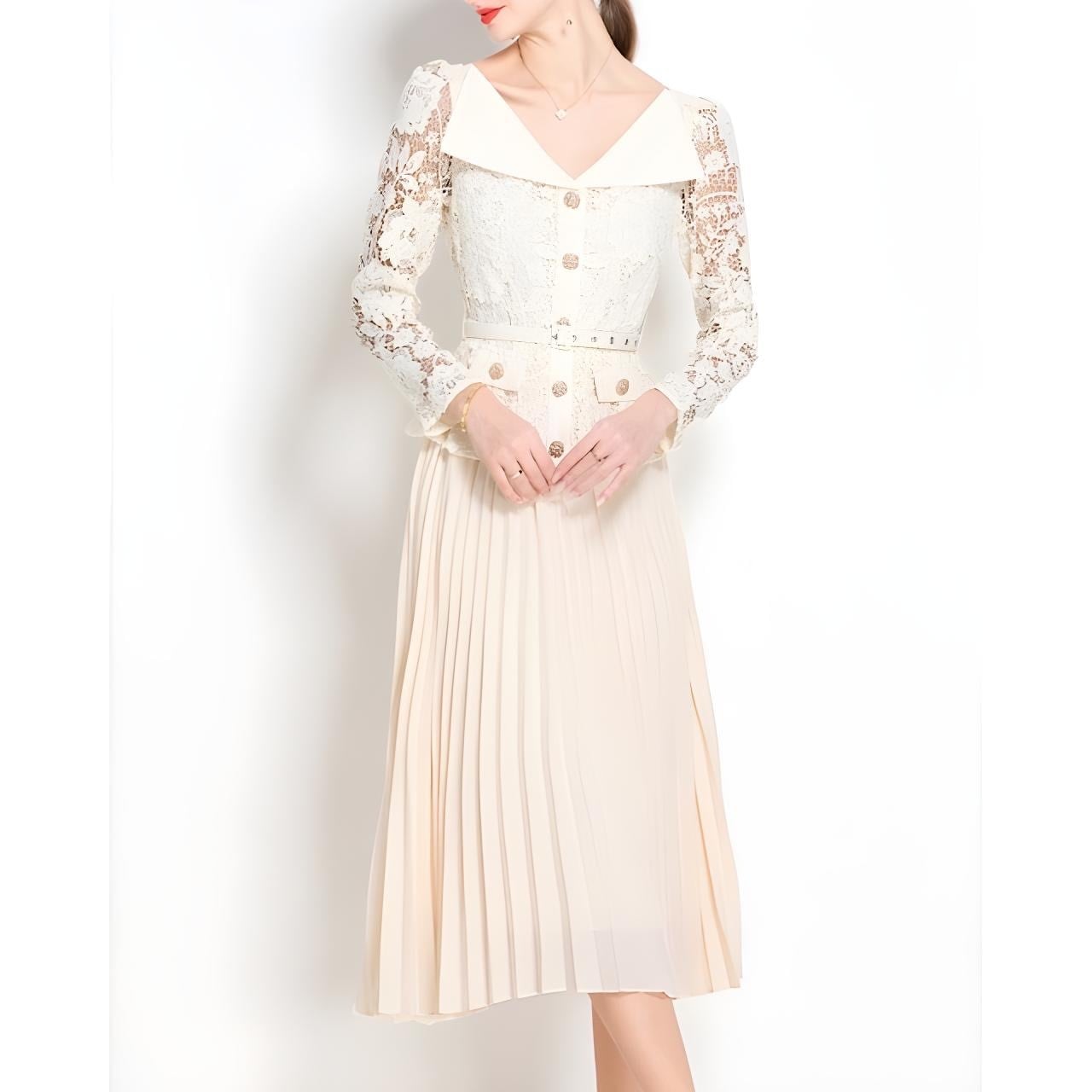 繊細なレースの上身頃と流れるようなプリーツスカートが、美しく調和したワンピースです。