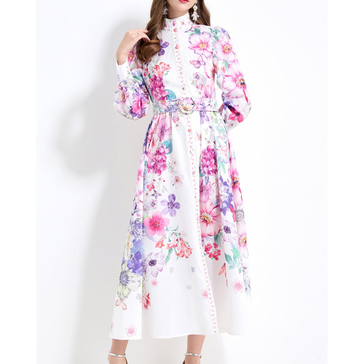 彩り豊かなフラワーデザインが全面に広がる、華やかさと上品さを兼ね備えたワンピースです。