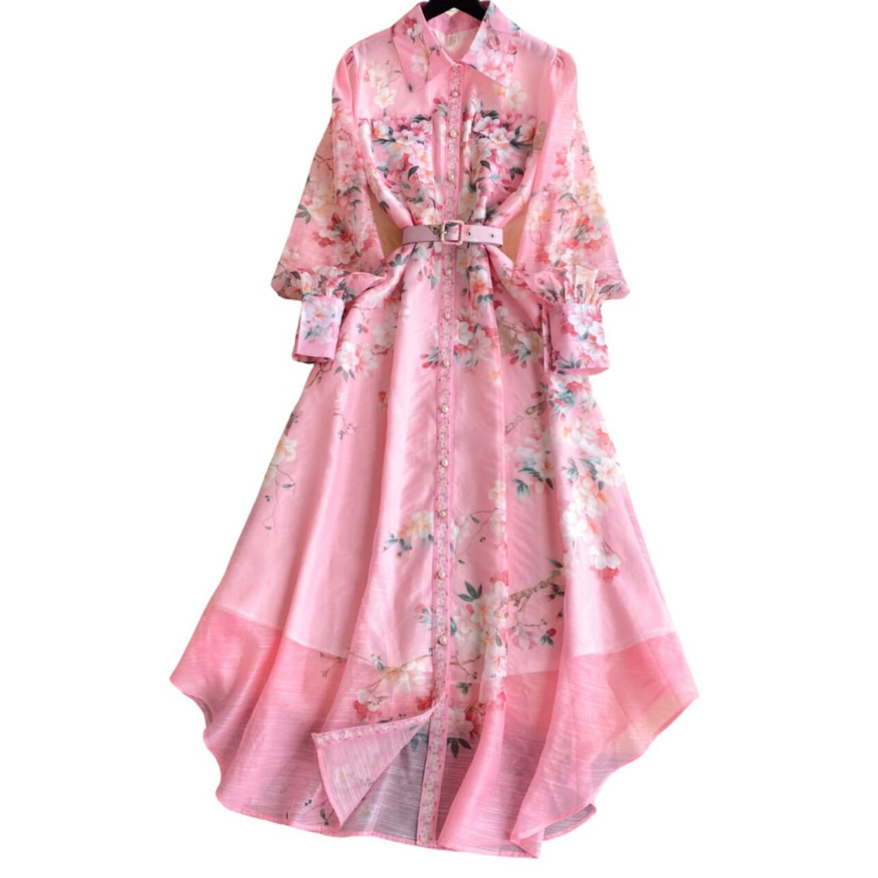 共布ベルトでウエストを引き締めることで洗練されたラインを演出し、特別なお出かけにも映える華やかな一着です。