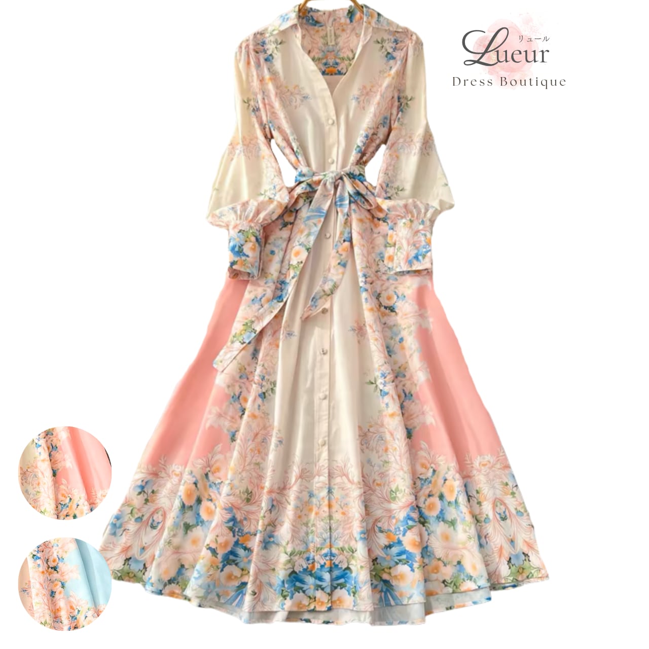ウエストリボンで自然にスタイルを整え、特別な日にも自信を持って纏える華やかな一着です。