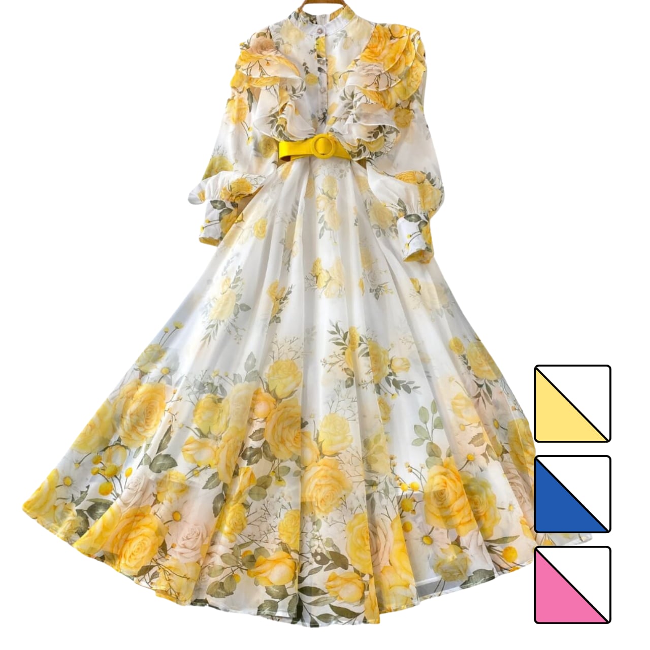 フラワーフリルハイネックベルトフレアワンピース 3color L2229