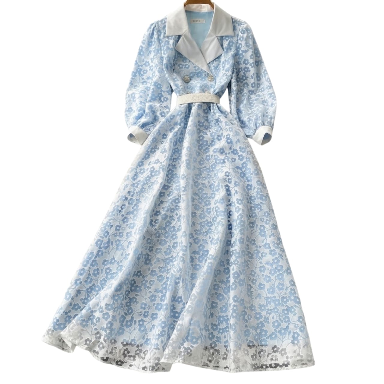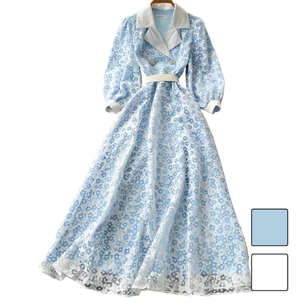 裾へと優雅に広がるフレアラインが歩くたびに揺れ、華やかさときちんと感を両立した装いを完成させます。