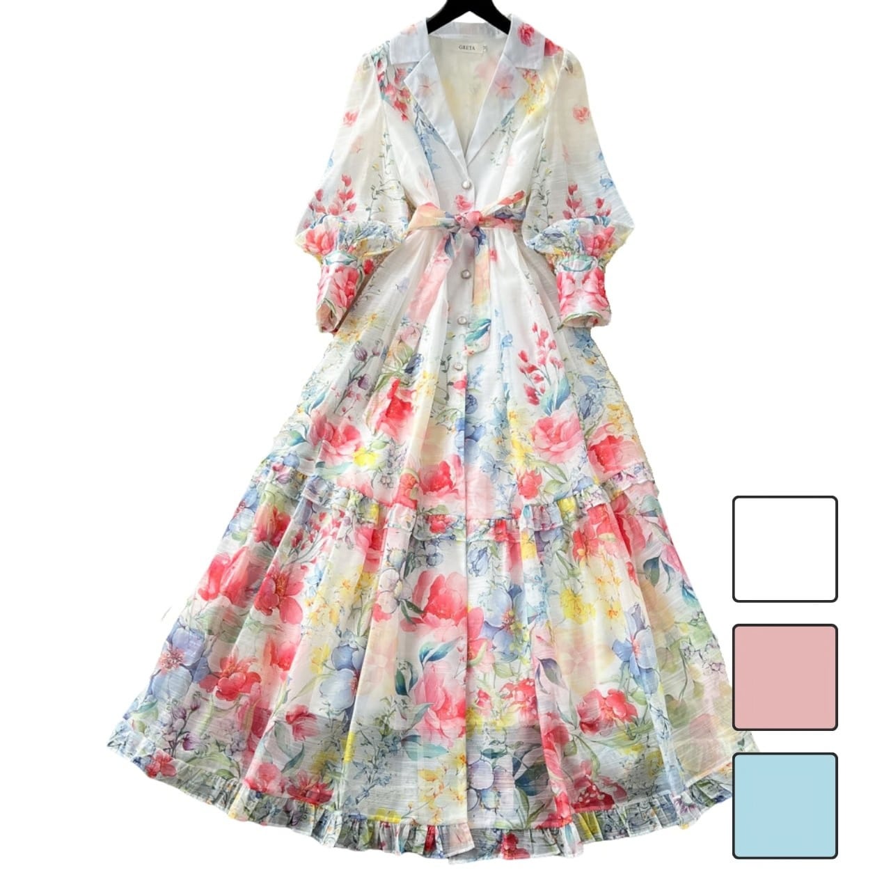 フラワーテーラーカラーウエストリボンフレアワンピース 3color L2243