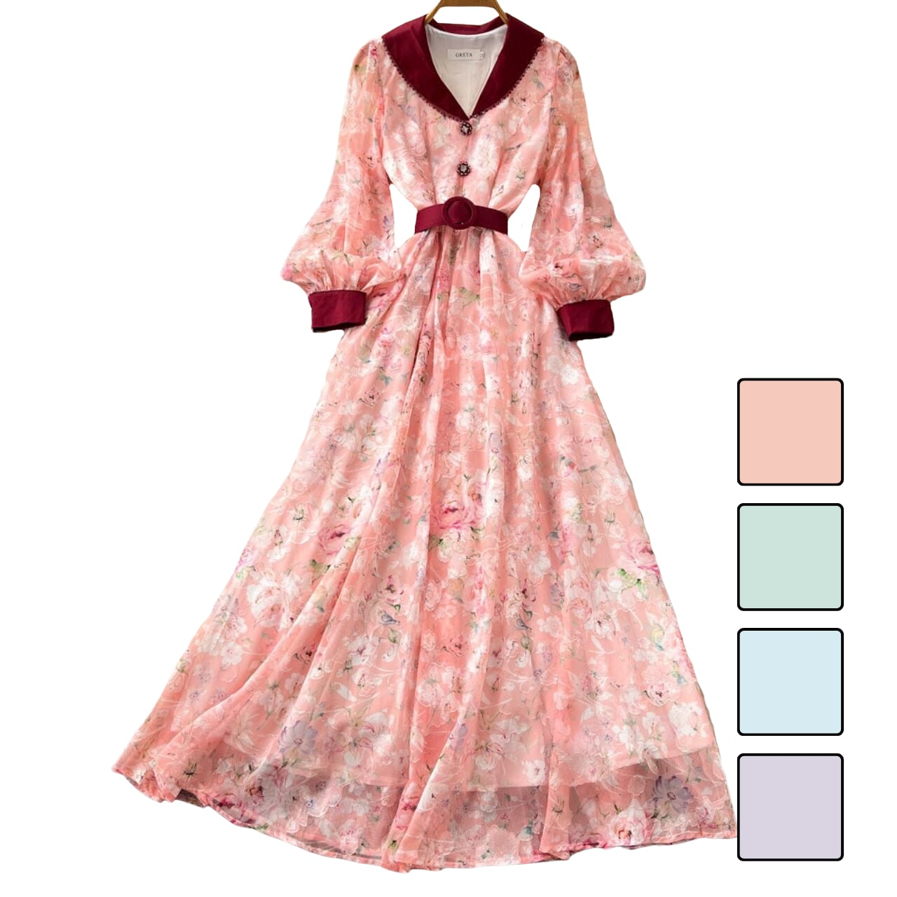フラワーVネックウエストマークロングワンピース 4color L2245