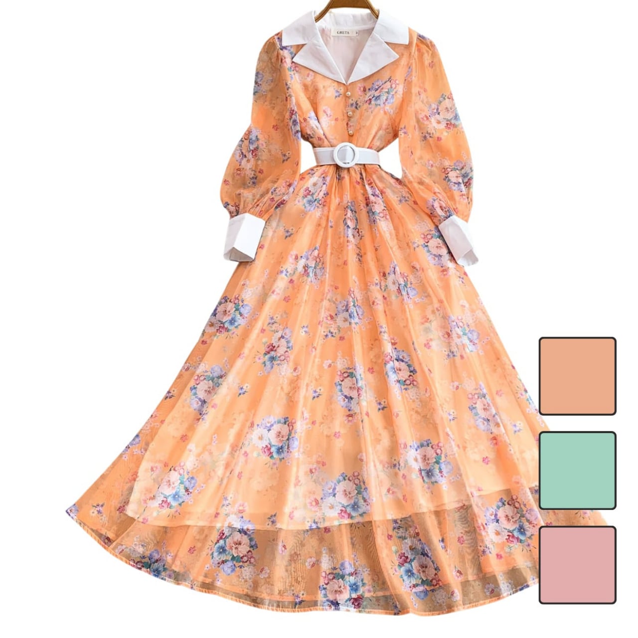 フラワーシャツカラーウエストマークワンピース 3color L2247