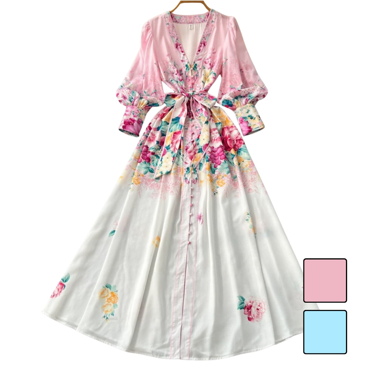 フラワーVネックウエストリボンフレアワンピース 2color L2251