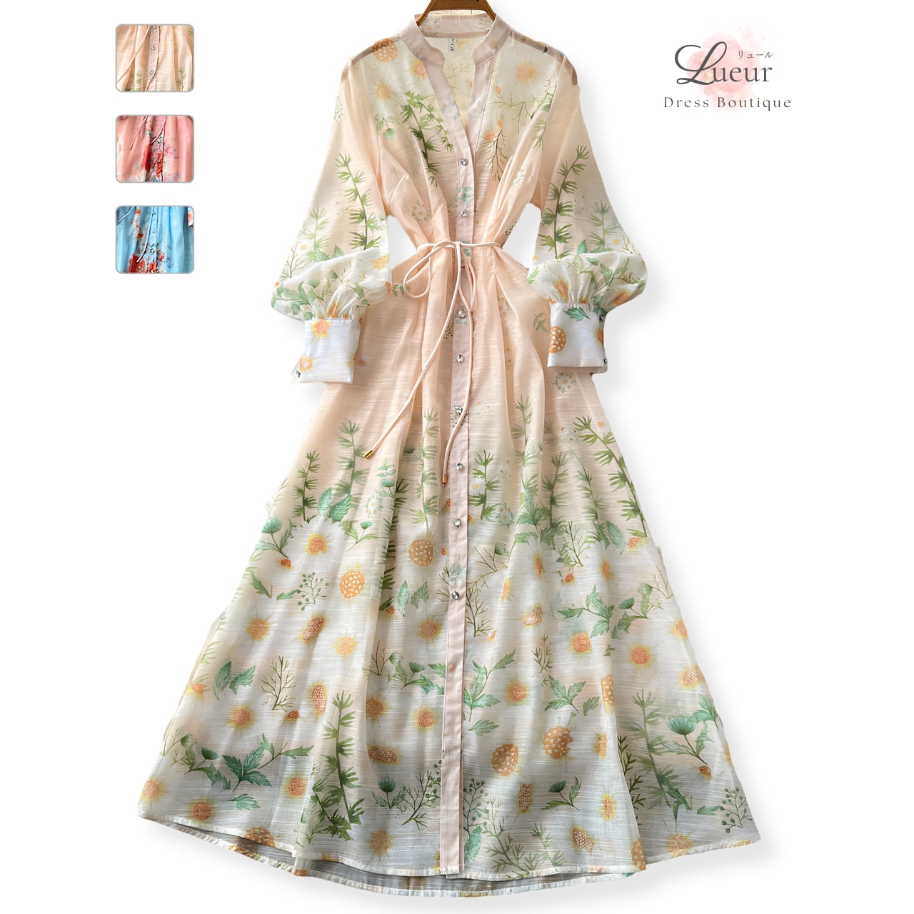 優美なボタニカルモチーフが全体に広がり、軽やかで華やかな印象を演出する一着。