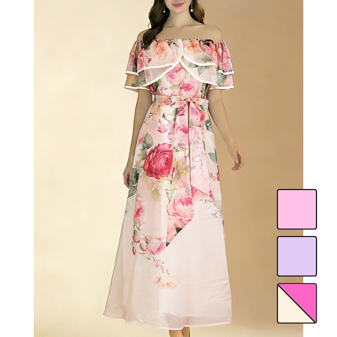 フラワーリボンデザインオフショルダーワンピース 3color L2260