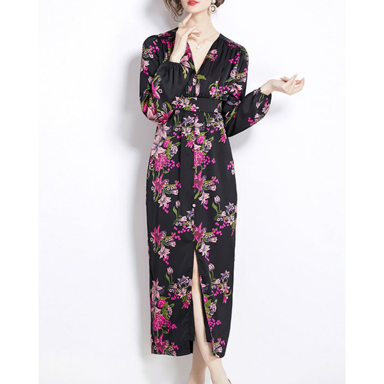 華やかなフラワーデザインが、シックな中にも女性らしい華やぎを添える一着です。