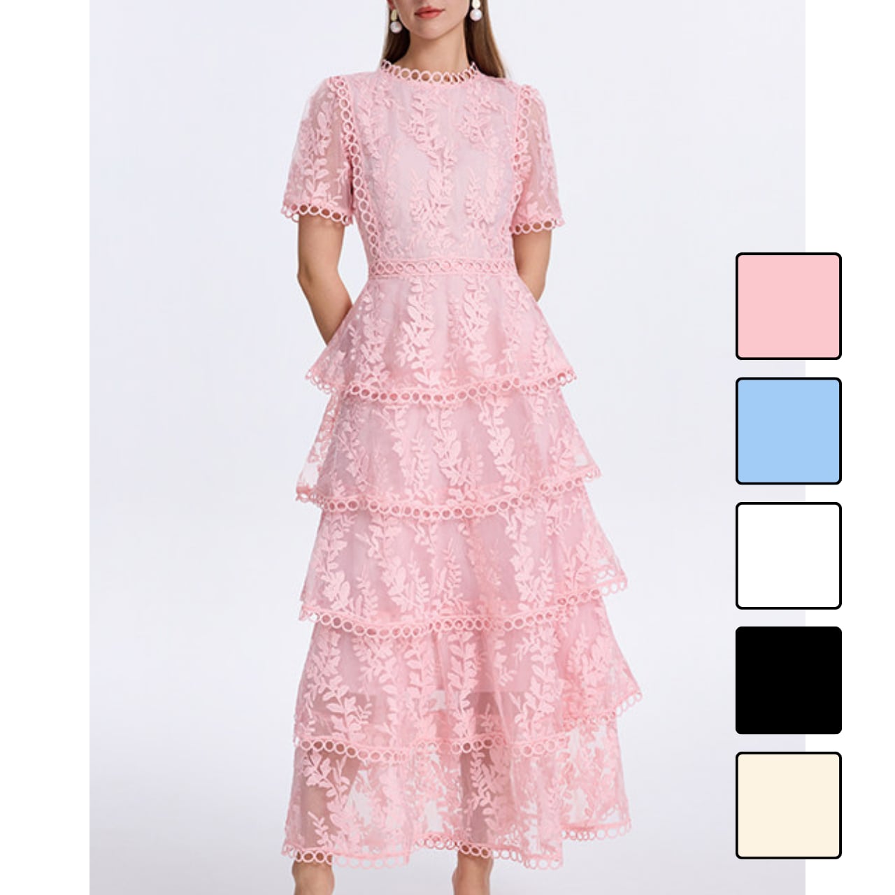 フラワー刺繍レースティアードワンピース 5color L2269