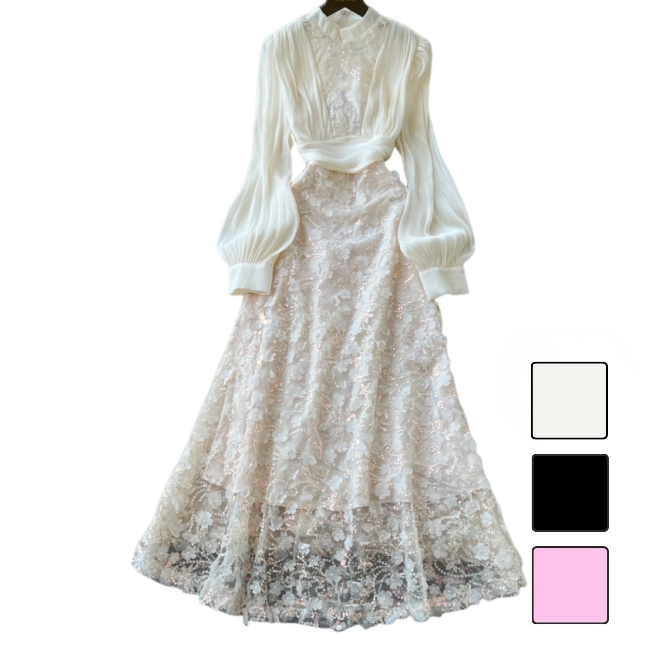 フラワー刺繍シアースタンドカラーワンピース 3color L2276