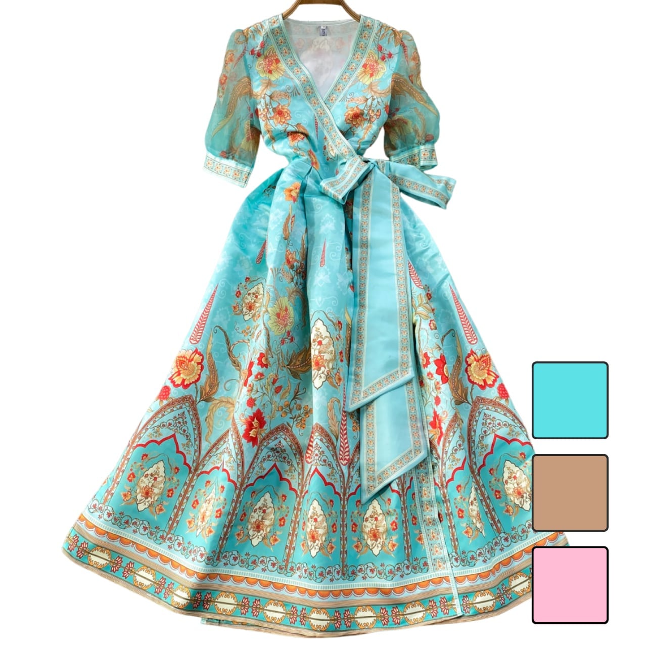 カシュクールデザインとウエストリボンが美しいラインを引き立て、女性らしいシルエットを演出します。