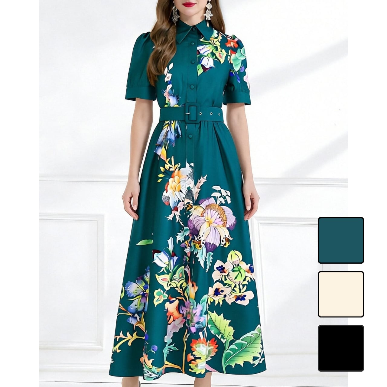 ウエストベルトとフロントボタンがクラシックな品格を引き立て、美しいシルエットを演出します。