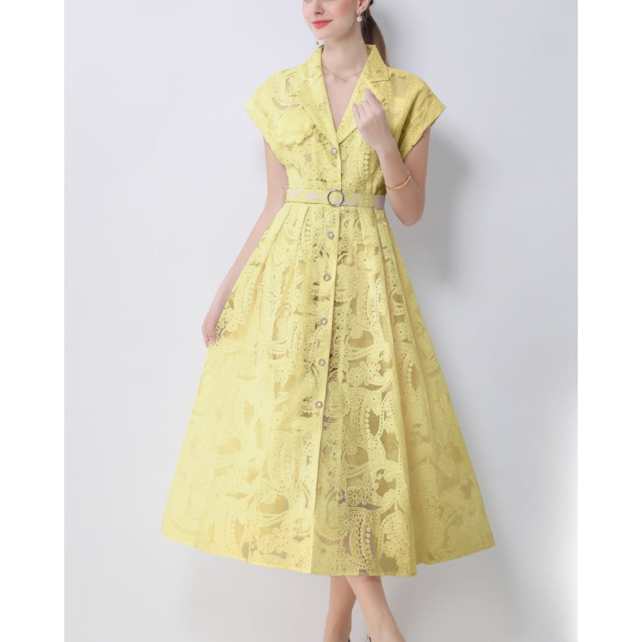 即納【 Mサイズ / イエロー 】スキッパーカラーレースワンピース L2094