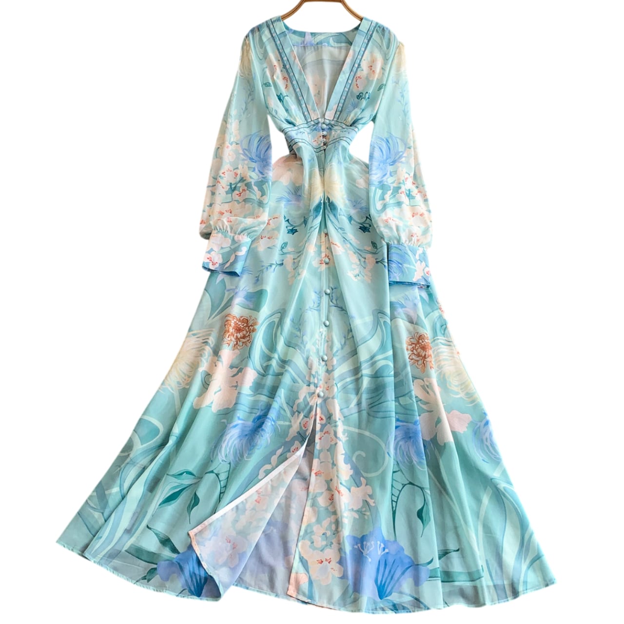 流れるようなボタニカルとフラワーモチーフが美しく映える、優雅な印象の一着。