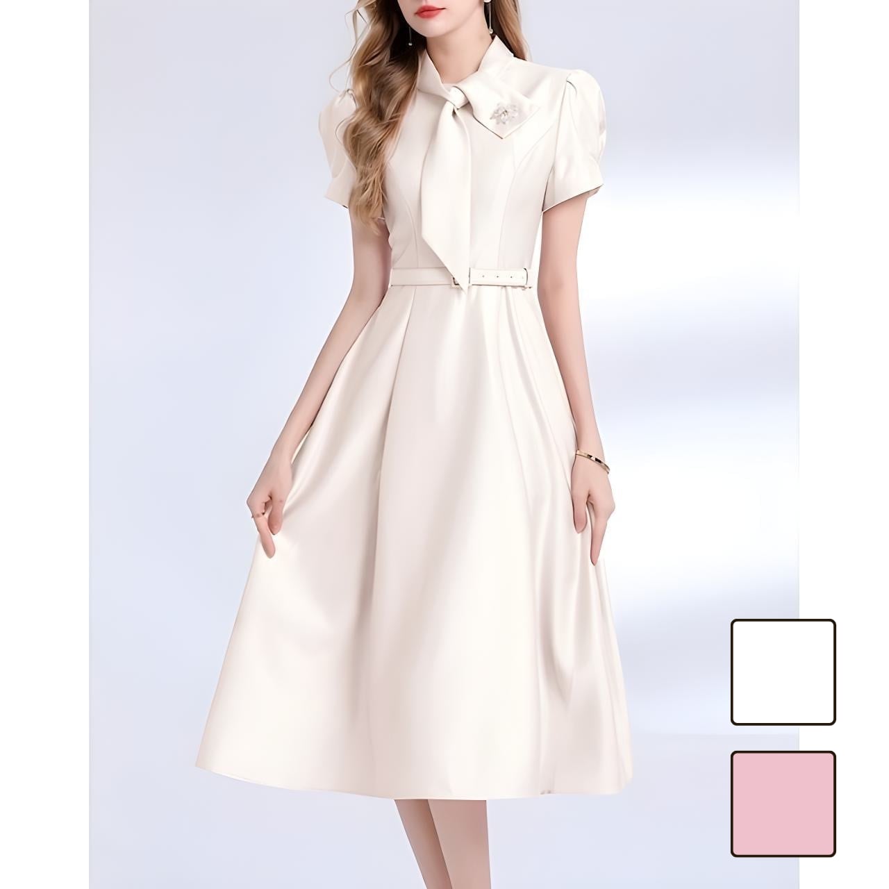 即納【 Mサイズ 】リボンデザインウエストタックパフスリーブワンピース 2color L1559