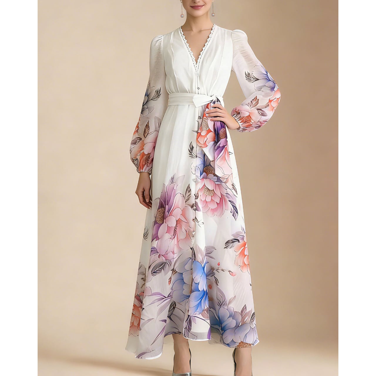 華やかなフラワーデザインと計算されたウエストタックが、上品で女性らしい美しさを引き立てます。