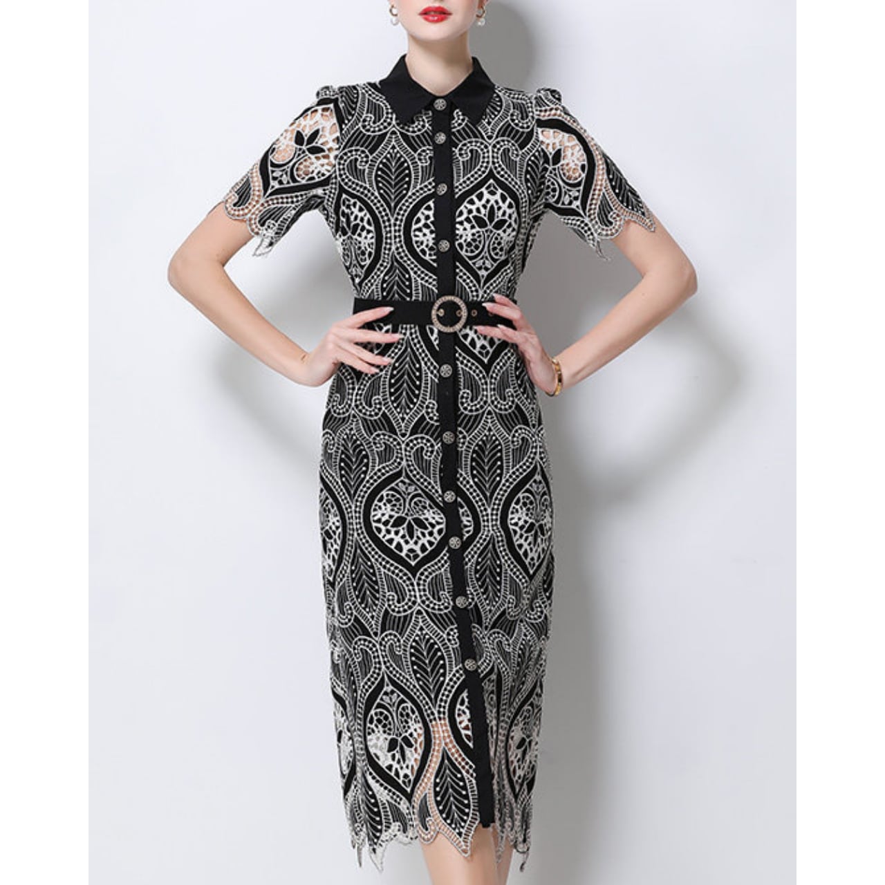 繊細なコードレースが全体に施され、気品あふれるクラシカルな雰囲気を演出します。