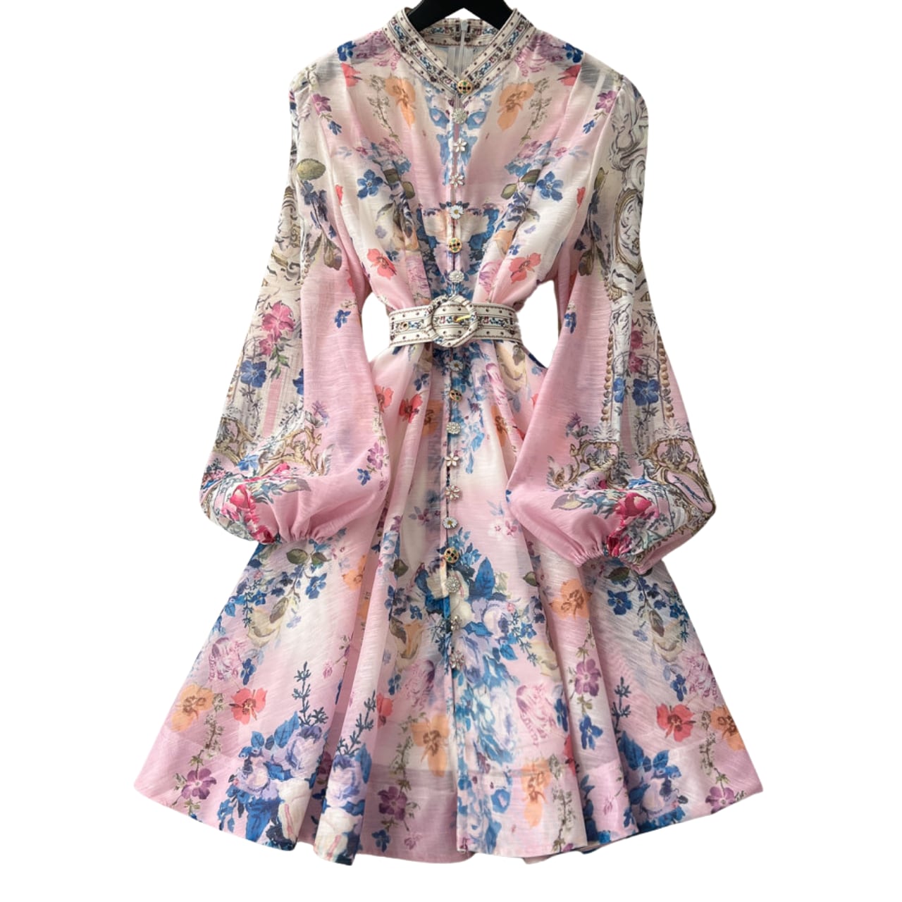 スタンドカラーとウエストベルトがクラシカルな雰囲気を引き立て、洗練された美しさを演出します。