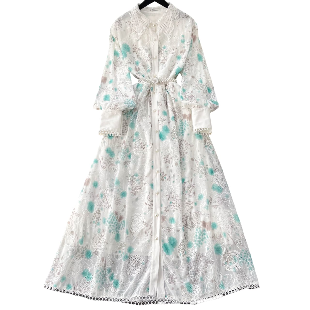 繊細なフラワーデザインとシアーな透け感が重なり、軽やかで華やかな印象を演出する一着。