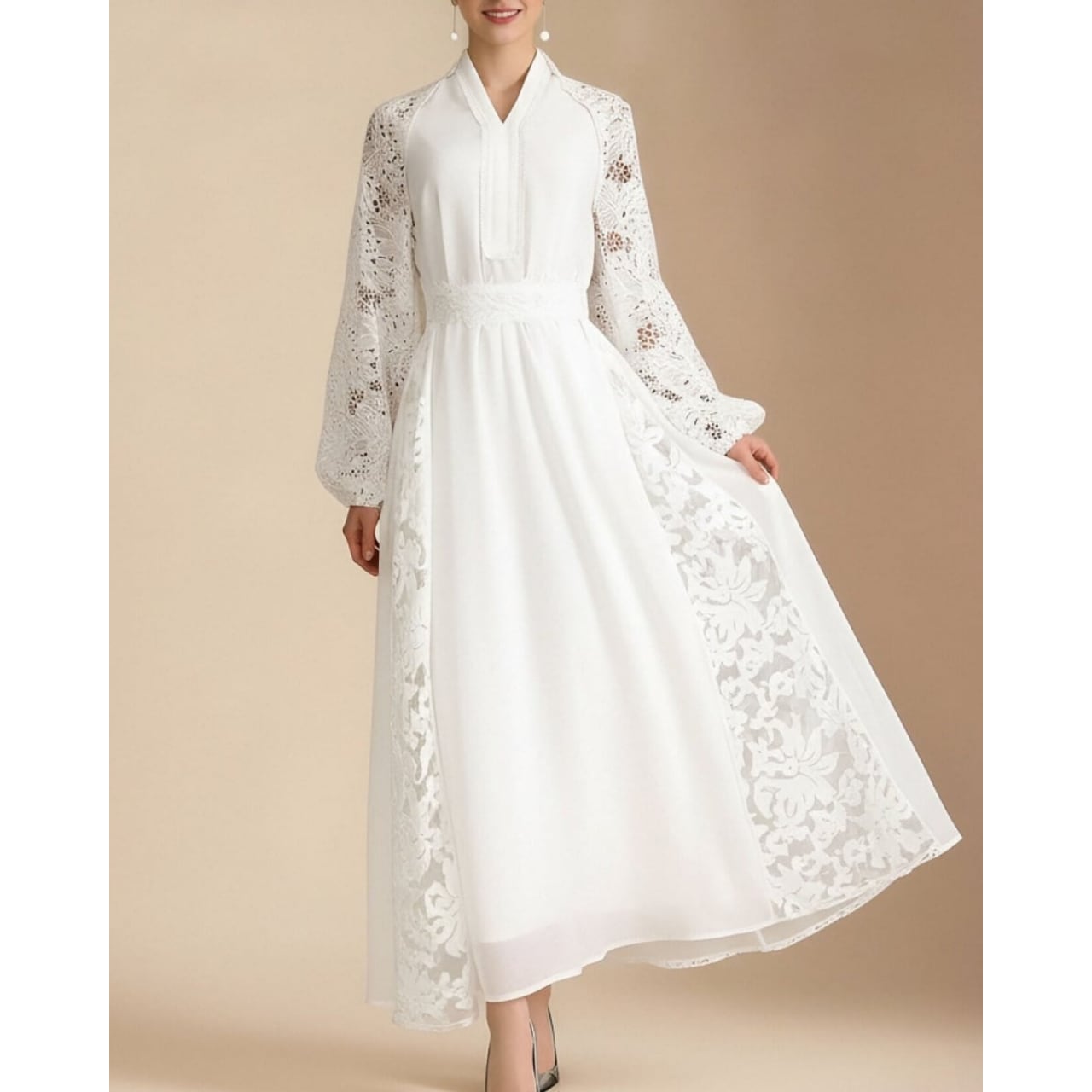 やわらかなシフォンと繊細なレースが重なり合う、上品で優雅な一着。