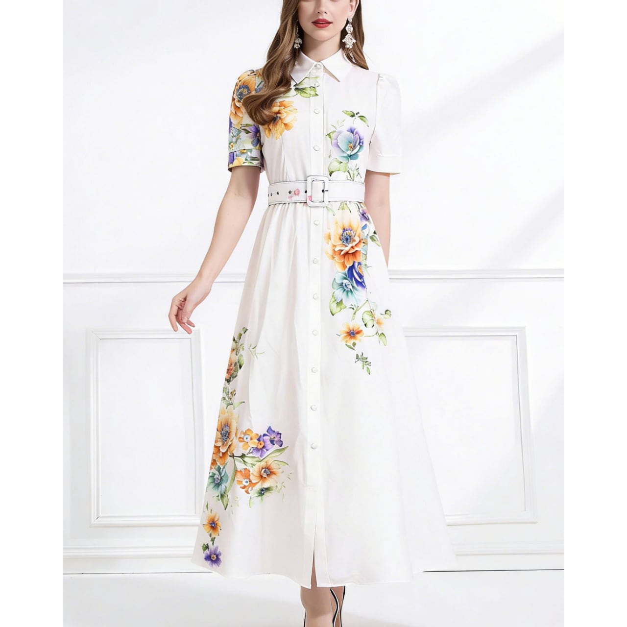 フロントボタンとウエストベルトが美しいシルエットを引き立て、女性らしいラインを際立たせます。